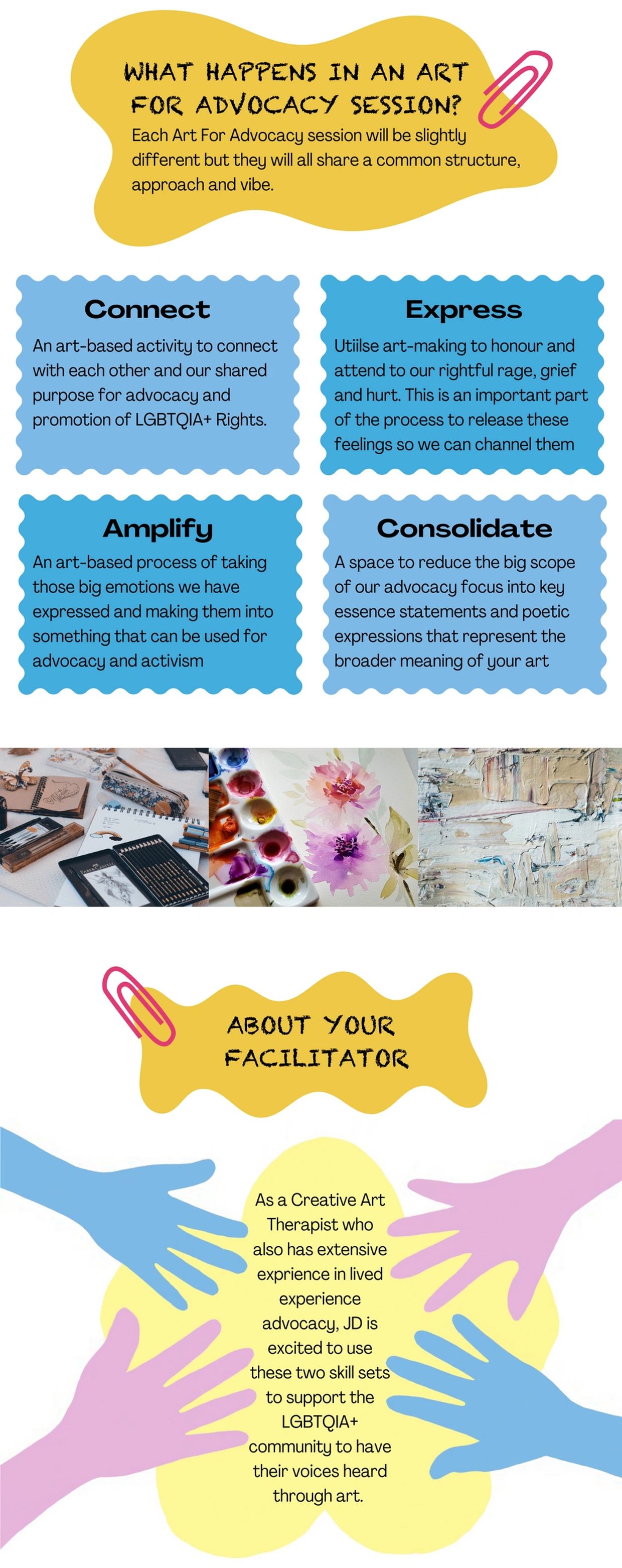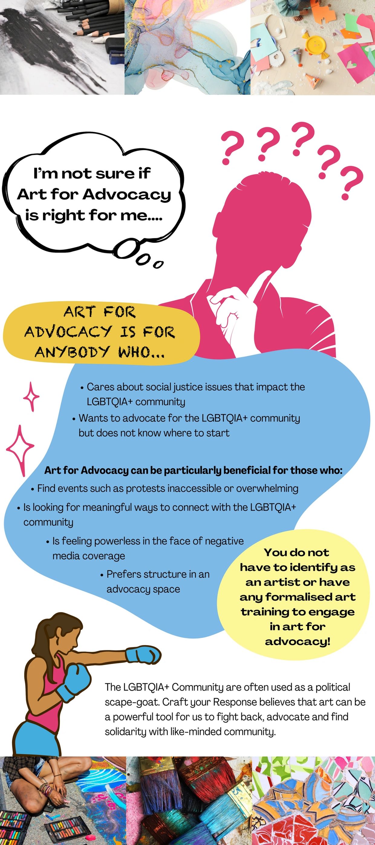 But sometimes making art to speak truth to power on your own can feel like screaming into the void. Art for Advocacy provides spaces for LGBTQIA+ people to connect and mobilise together about what's important to us.
